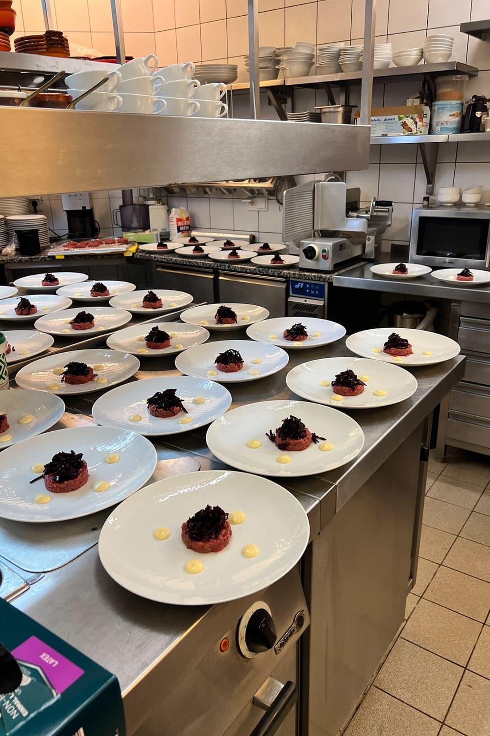 Schnell wurde jedem Teilnehmer bewusst, dass dies ein rundum gelungenes Event werden würde. Den Auftakt bildete ein Amuse-Gueule in Form einer Gazpacho mit gegrilltem Gemüse und frischen Kräutern. Als Vorspeise folgte ein Rindertatar mit Trüffelmayonnaise, umrahmt von Champignons und Roter Bete. Schon der Anblick ließ Köstliches erahnen. Nach einer kurzen Pause wurde der Hauptgang serviert: rosa gegarter Kalbstafelspitz mit Selleriepüree, konfierten Kartoffeln und wildem Brokkoli. Alle Teilnehmer waren sich einig – ein Gaumengenuss auf höchstem Niveau. Den krönenden Abschluss bildete ein traumhaftes Dessert aus Limettenmousse mit Kirschen und Sauerrahmeis.